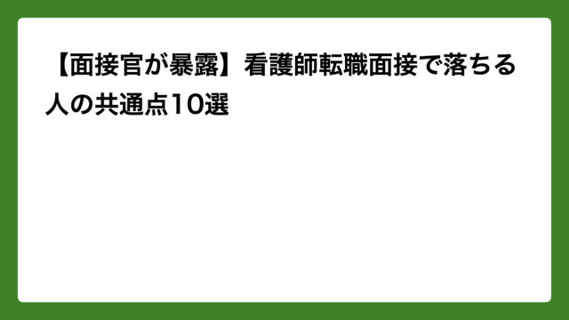 転職 【面接官が暴露】看護師転職面接で落ちる人の共通点10選 2026年4月11日 ナナ 「面接って何を見ているんだろう…」と気になったことはありませんか? 私はこれまで看護師の採用面接を100名以上担当してきました。その …