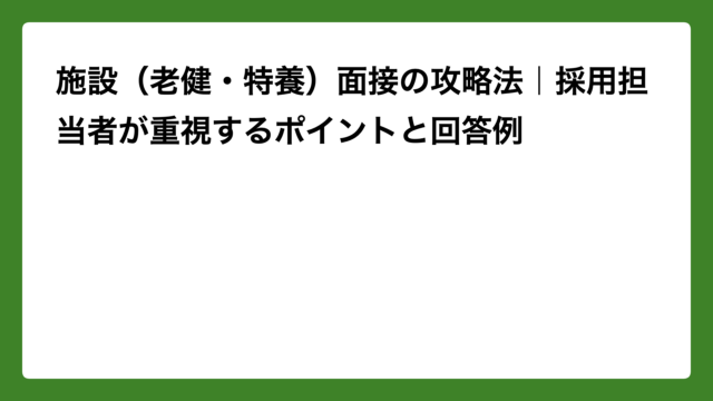 転職 施設(老健・特養)面接の攻略法|採用担当者が重視するポイントと回答例 2026年4月11日 ナナ 「急性期からの転職だけど、施設の面接でどんなことを聞かれるの?」「老健と特養って面接内容が違うの?」――そんな疑問を持つ看護師さんへ。 …