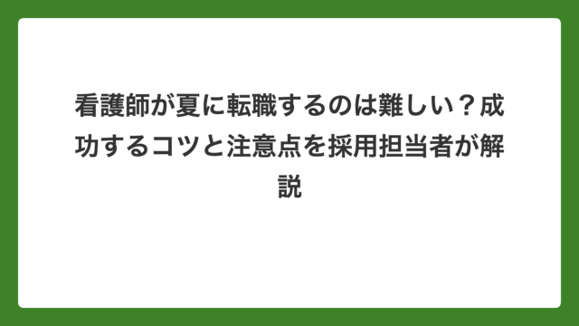 転職 看護師が夏に転職するのは難しい?成功するコツと注意点を採用担当者が解説 2026年4月25日 Nana 「ボーナスをもらってから転職したい」「今の職場にもう限界…夏のうちに動きたい」 看護師の転職相談をしていると、夏(6〜8月)のタイミ …