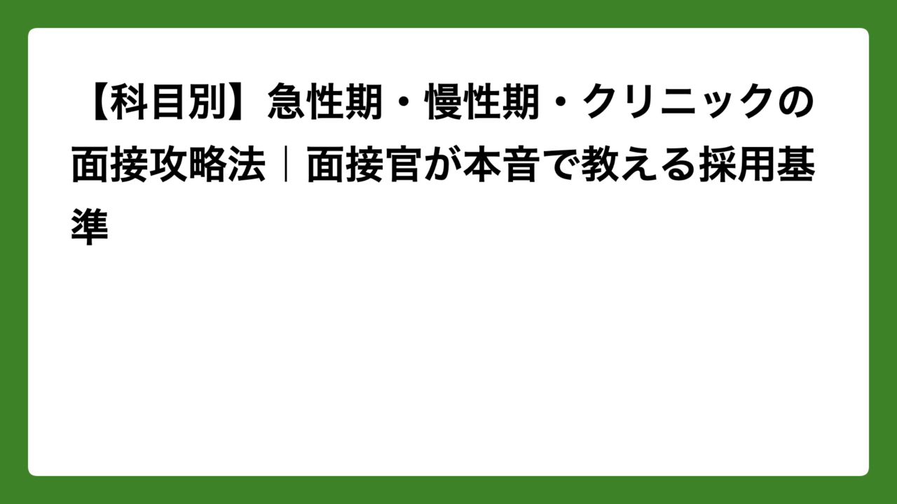医療機関ごとの採用基準を理解した上で面接に臨むことで、準備の質が格段に変わります。面接の基本的な準備は面接でよく聞かれる質問と答え方15選もあわせてご確認ください。